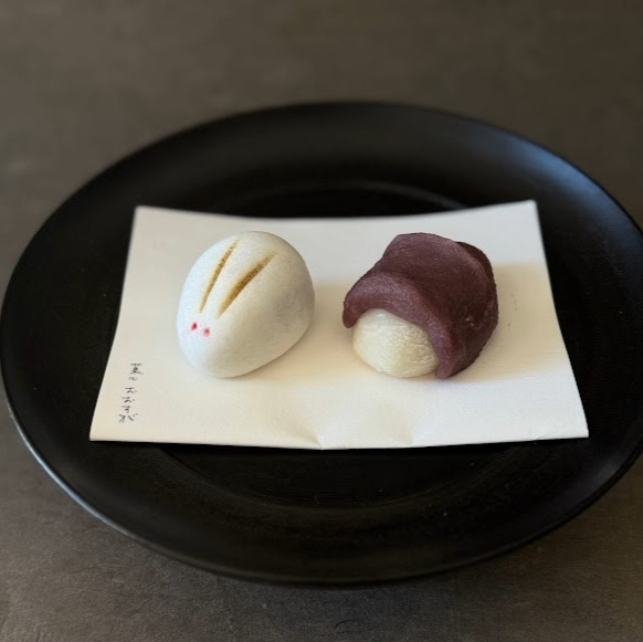 お月見団子は関西風。「芋名月」にちなんで「里芋」に似せたあんこを巻き付けた細長いしずく形です。可愛い表情のうさぎ薯蕷は、「栗名月」にちなみ、栗餡の薯蕷饅頭にしています。
