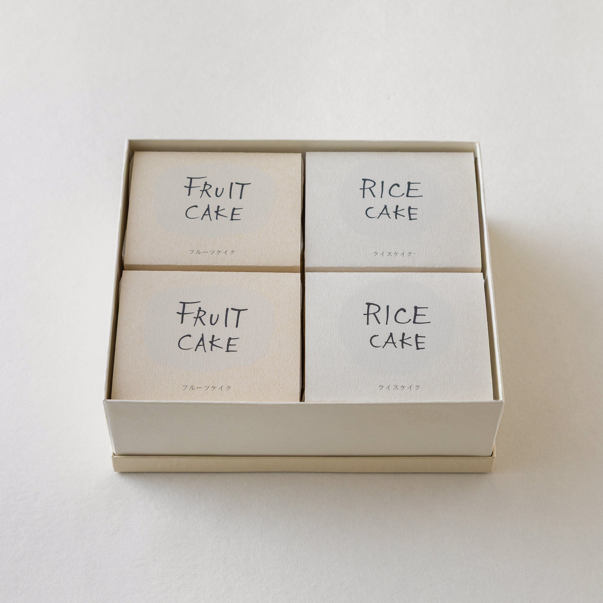 原材料[RICECAKE] 卵(国内産)、砂糖、米粉、味醂、米飴、豆乳、米油、昆布、(一部に卵を含む) [FRUITCAKE] 小麦粉(国内製造)、砂糖、卵、バター、米油、蜂蜜、オレンジ、レーズン、チェリー、パイン、ラム酒、米油/膨張剤、(一部に小麦・卵・乳成分・大豆・オレンジを含む)